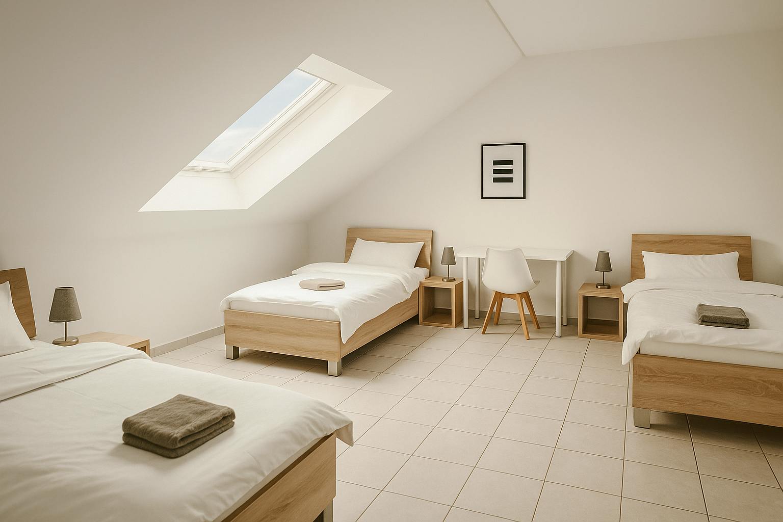 Die Zimmer verfügen über 3 Einzelbetten. Zudem wird das Badezimmer und die Küche mit anderen Gästen gemeinsam genutzt. WLAN und Parkplätze sind gratis. Des Weiteren haben wir eine Waschmaschine. Der Check-In erfolgt automatisiert durch Codes. Diese Codes werden Sie einen Tag vor der Anreise von uns per Chat bekommen. Sie können ab 14 Uhr flexibel einchecken, auch spät Abends. Check-Out wäre um 9 Uhr morgens.