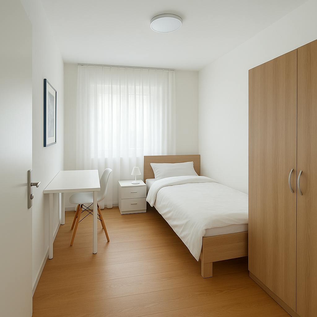 Das Zimmer verfügt über 1 Einzelbett. Zudem wird das Badezimmer und die Küche mit anderen Gästen gemeinsam genutzt. WLAN und Parkplätze sind gratis. Des Weiteren haben wir eine Waschmaschine. Der Check-In erfolgt automatisiert durch Codes. Diese Codes werden Sie einen Tag vor der Anreise von uns per Chat bekommen. Sie können ab 14 Uhr flexibel einchecken, auch spät Abends. Check-Out wäre um 9 Uhr morgens.